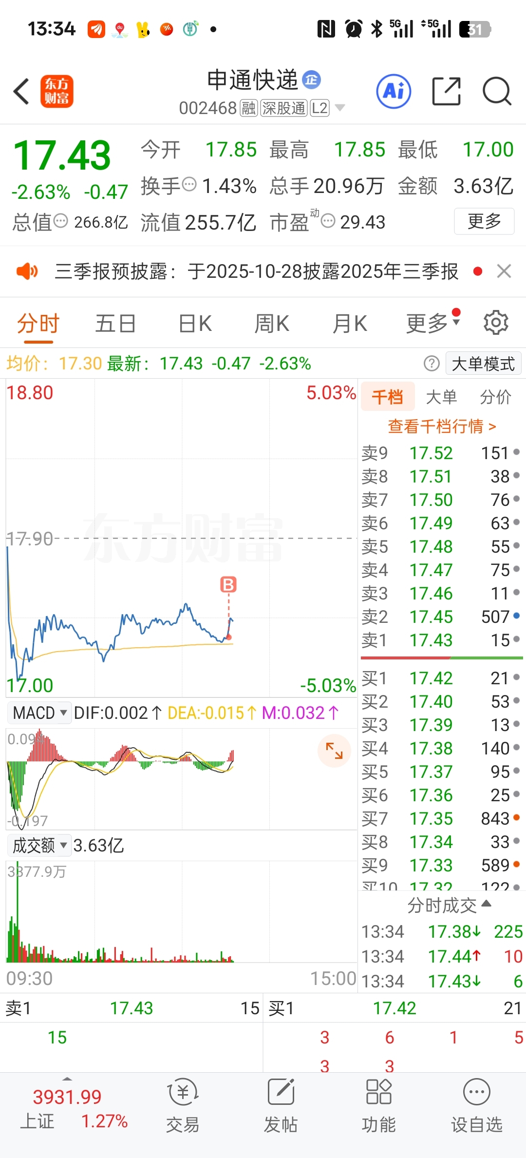 $申通快递(SZ002468)$ 我买了。卧倒随你表演了。
