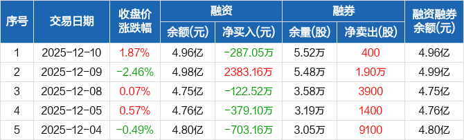 申通快递:融资净偿还287.05万元,融资余额4.96亿元(12-10)