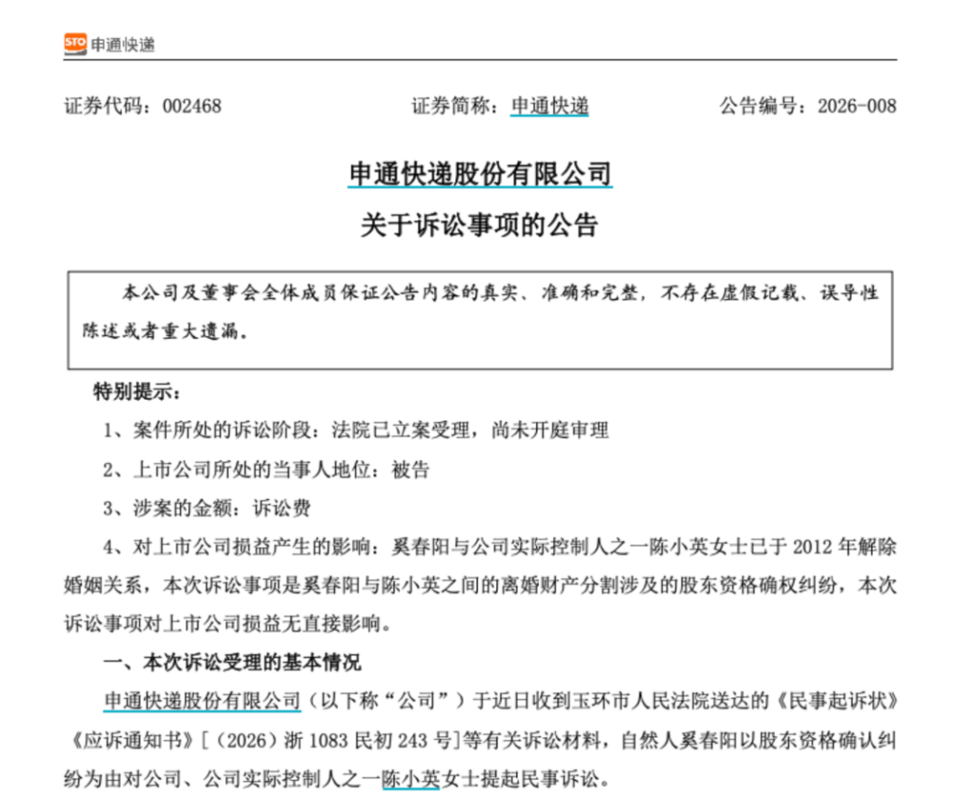 申通快递在公告中表示,奚春阳与陈小英已于2012年解除婚姻关系,本次诉讼事项是奚春阳与陈小英之间的离婚财产分割涉及的股东资格确权纠纷,涉诉的股份数量约占上市公司的股份比例为1.33%,不会对公司正常生产经营造成重大不利影响,不会对公司的内部治理和规范运作产生重大不利影响,也不会对公司的实际控制权产生影响。