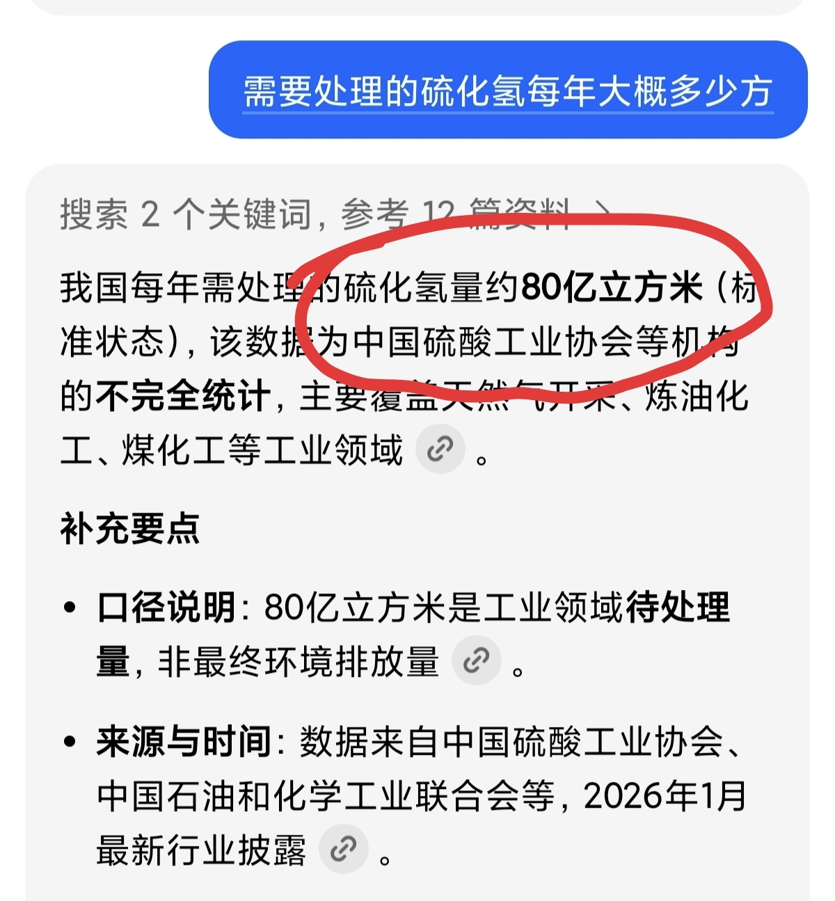 三维化学几乎百分百硫化氢分解。市场巨大。我国每年需要处理的硫化氢估略统计有80亿