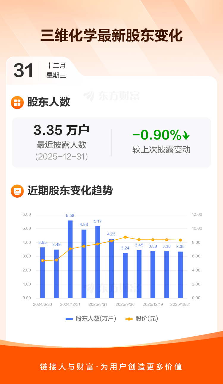 三维化学最新披露数据显示,截至12月31日公司股东户数为3.35万户,较上期(2025年12月20日)减少306户,降幅为0.90%。户均持有流通股数量由上期的1.86万股上升至1.88万股,户均持股金额由上期的15.60万元增加至15.66万元。