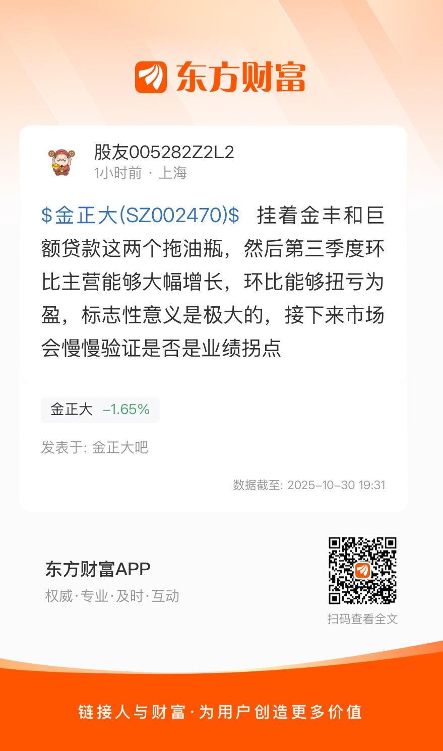 $金正大(SZ002470)$ 挂着金丰和巨额贷款这两个拖油瓶,然后第三季度环比主营能够大幅增长,环比能够扭亏为盈,标志性意义是极大的,接下来市场会慢慢验证是否是业绩拐点