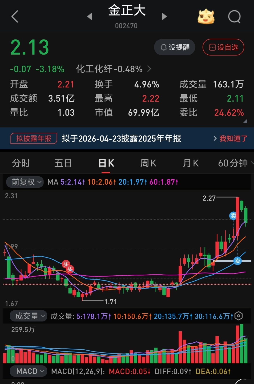 $金正大(SZ002470)$ 持币过节是最稳妥的,涨停那天没出仓位的该自我反思,金正这票不要幻想一下子暴涨,我涨停前一天出了一成仓,2.27涨停价出了三成仓,想着涨停后次日应该会有溢价再出一成仓,持五成仓过春节,没想到昨天直接低开。这种走势现在不做操作了,等节后跌不动四成仓位再干进