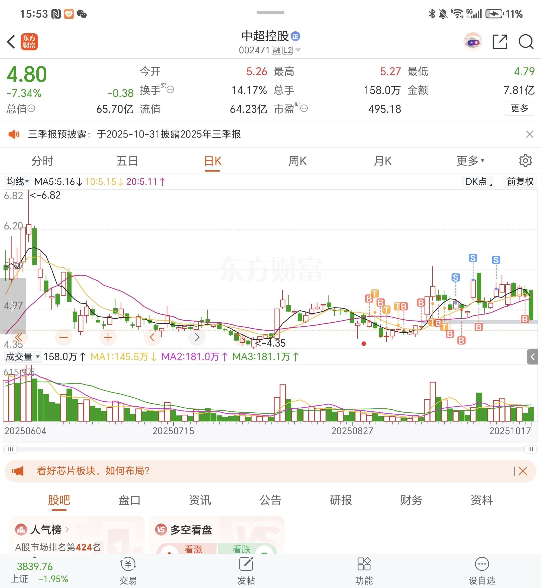 $中超控股(SZ002471)$ 这个大阴柱子,等我下个星期把别的仓位卖了来这里补满,锁仓年底见,今天是加仓的最佳位置