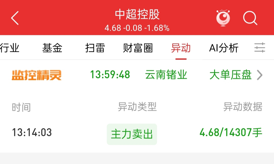 $中超控股(SZ002471)$ 1点14分主力出货