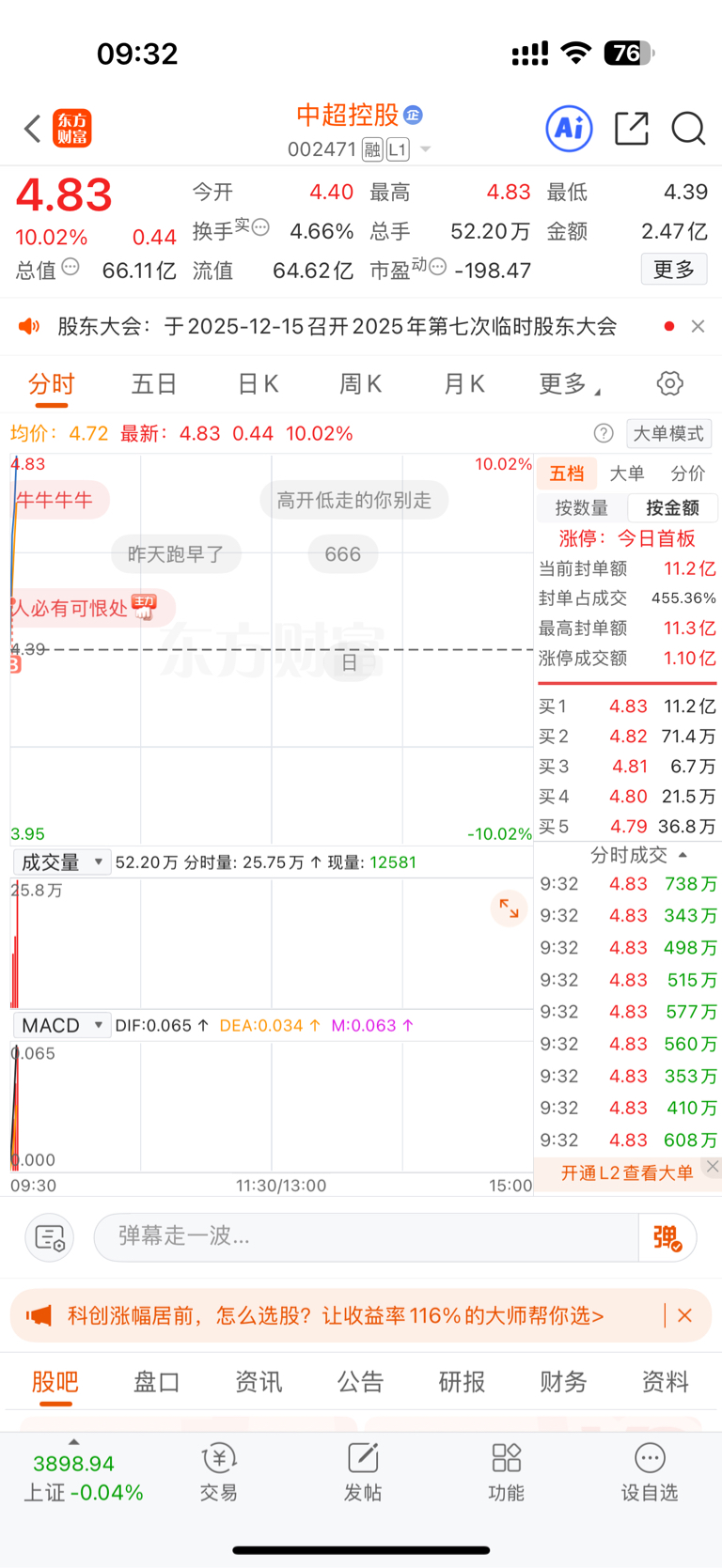 $中超控股(SZ002471)$ 昨晚看了这只票,航天加军工加重组,好票,晚上做梦梦见涨停,今早开盘就进,哈哈哈