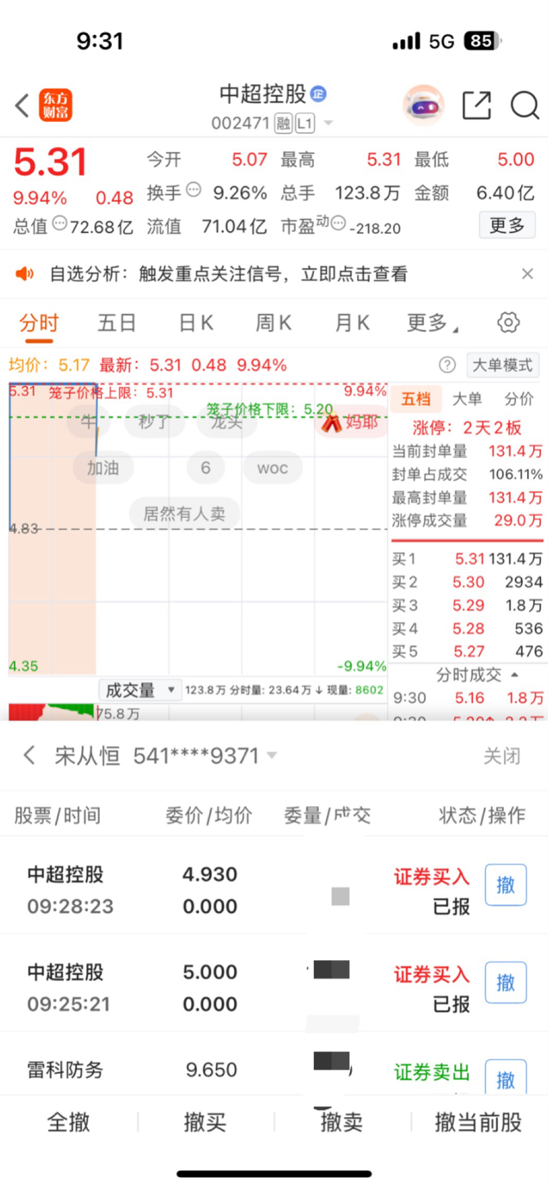 $中超控股(SZ002471)$ 最低5.00,挂单5.00,错失一个涨停,难受