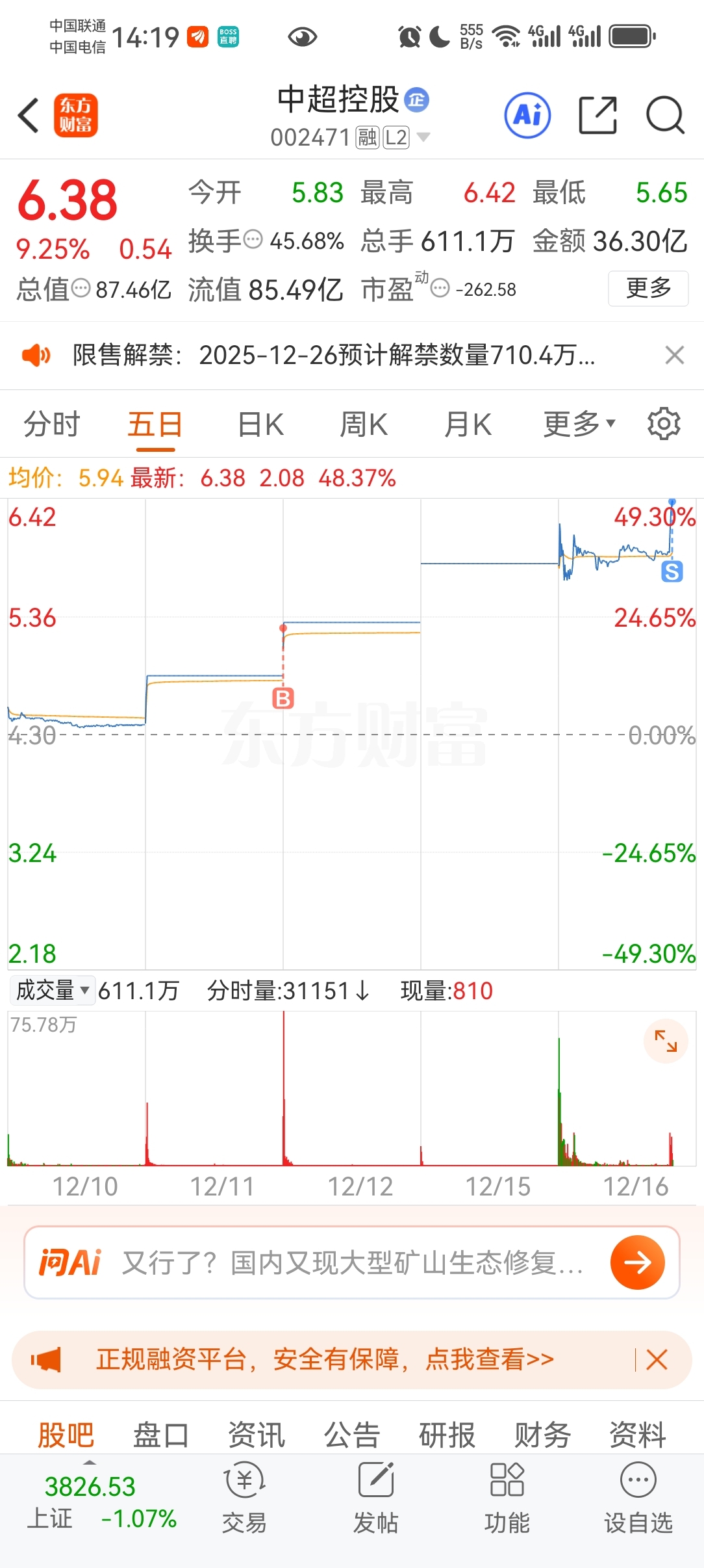 $中超控股(SZ002471)$ 吃了20个点应该还行吧
