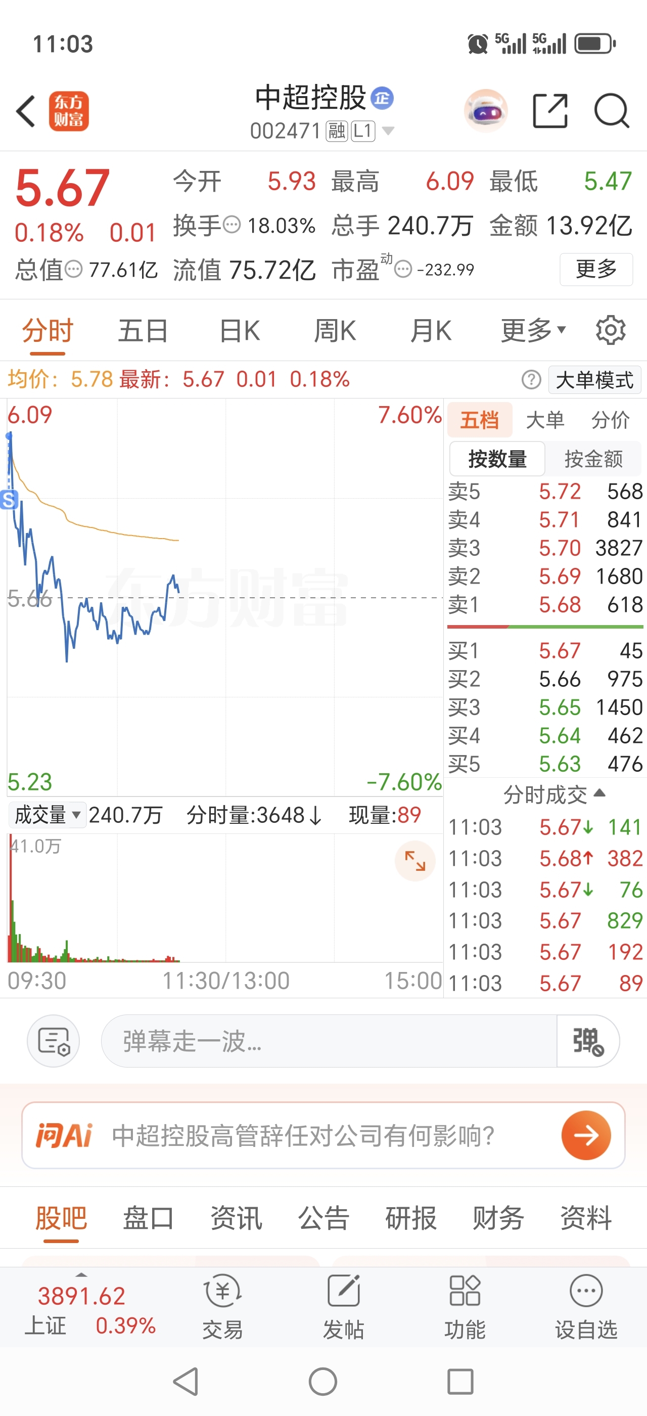 $中超控股(SZ002471)$ 开盘就挂单卖出