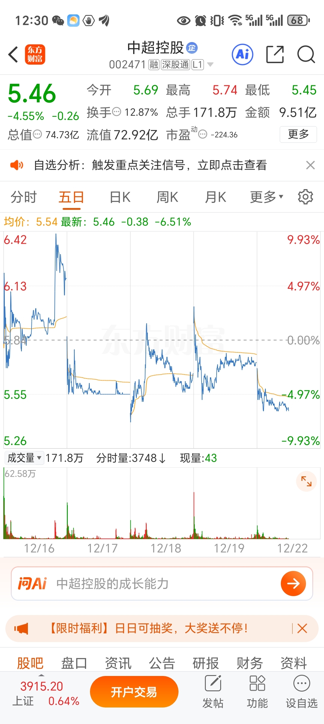 近五日走势图,看明白你就拿着,看不好你就走。不要满仓干,这个行情适合留点仓位高抛