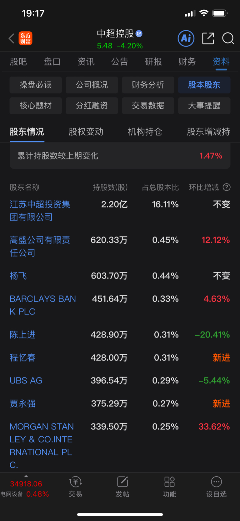 $中超控股(SZ002471)$ 第二大股东:高盛,第四大股东巴克莱银行(BARCLAYS BANK PLC),第七大股东瑞银集团(UBS AG),第九大股东摩根士丹利(MORGAN STANLEY & CO.INTENATIONAL PLC),怎么全是外资在集体看好中超控股?
