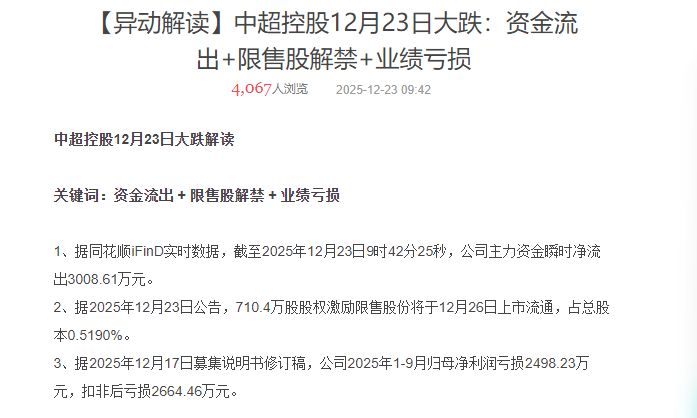 【异动解读】中超控股12月23日大跌:资金流出+限售股解禁+业绩亏损