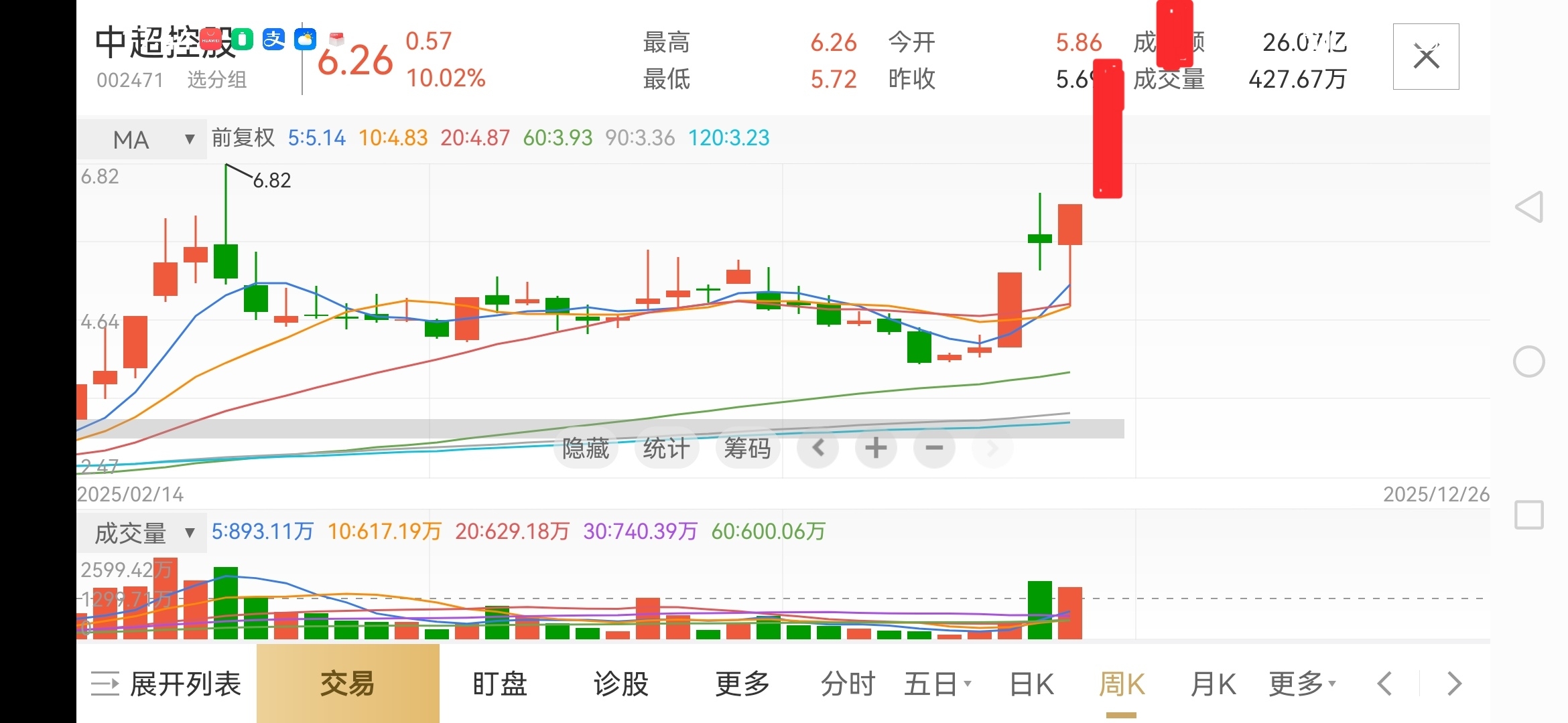 $中超控股(SZ002471)$ 连续3个涨停板,下周,节后8个涨停板