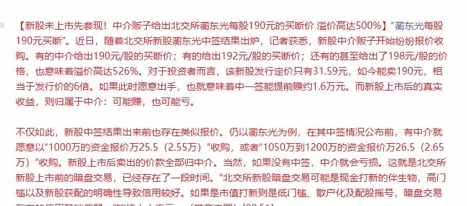北交所新股蘅东光未上市即遭中介溢价500%、每股190元买断,直接透支未来长期涨幅,不给二级市场散户留成长空间。