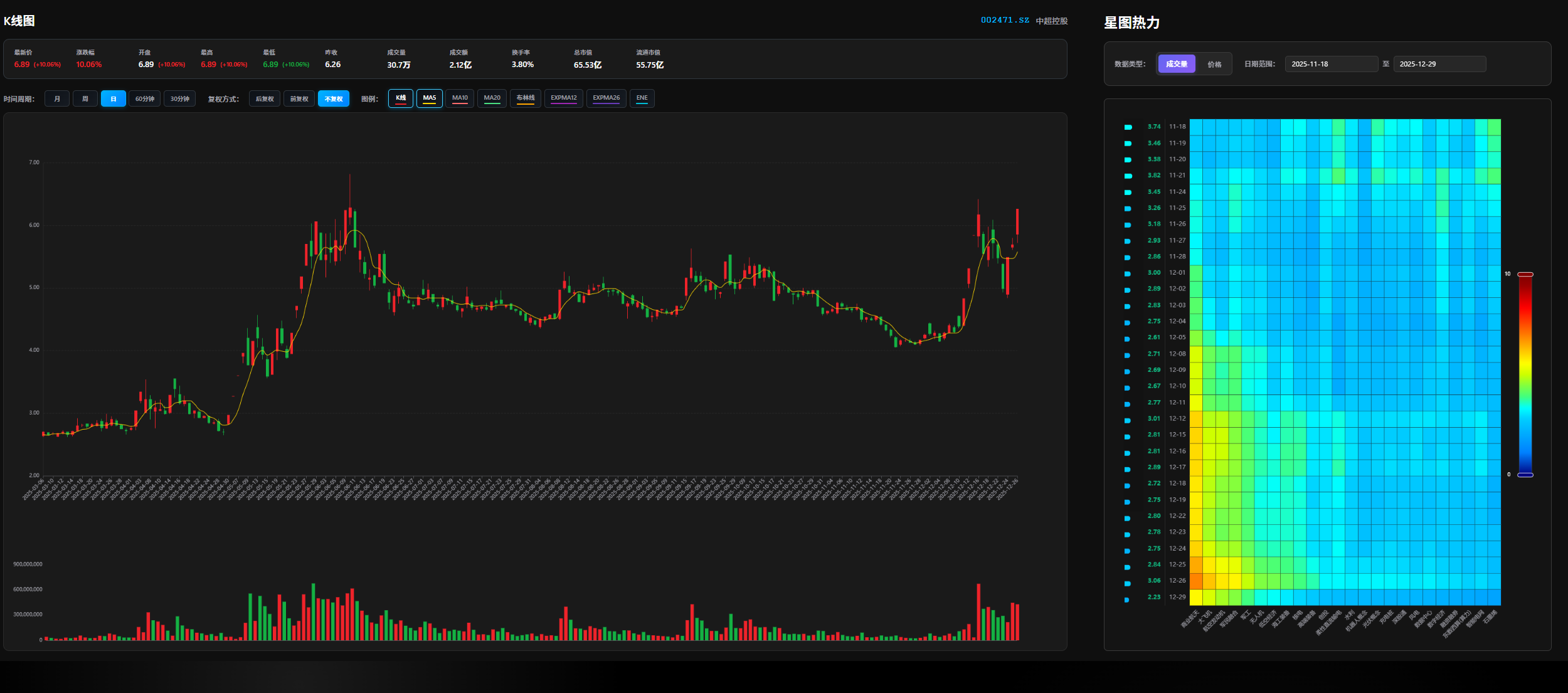 1. 早盘大盘热度创近一个月新低,热力图左边数值显示大盘热度只有1.98。2.第二张个股热力图颜色显示中超控股个股热度略微回落,注意风险。