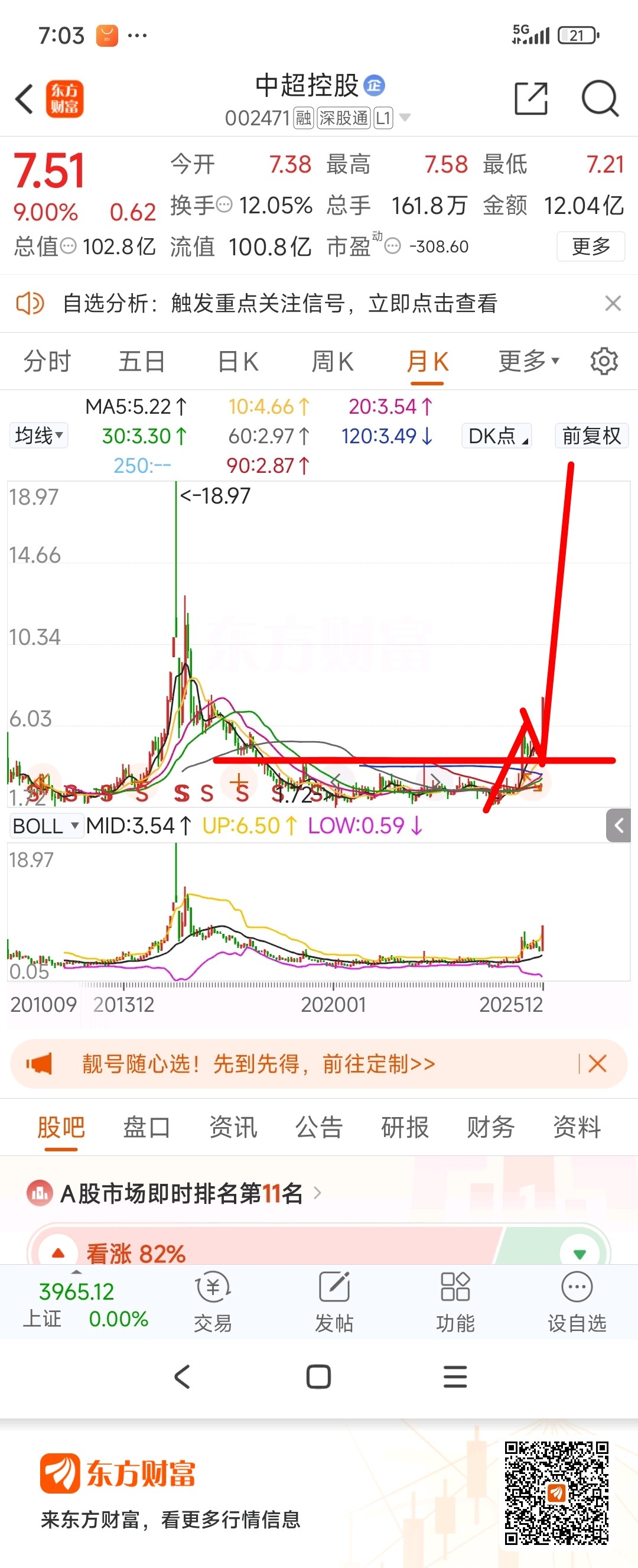 $中超控股(SZ002471)$ 月线复合头肩底回踩颈线,顶峰见,明天成交量45亿,换手放量启动板