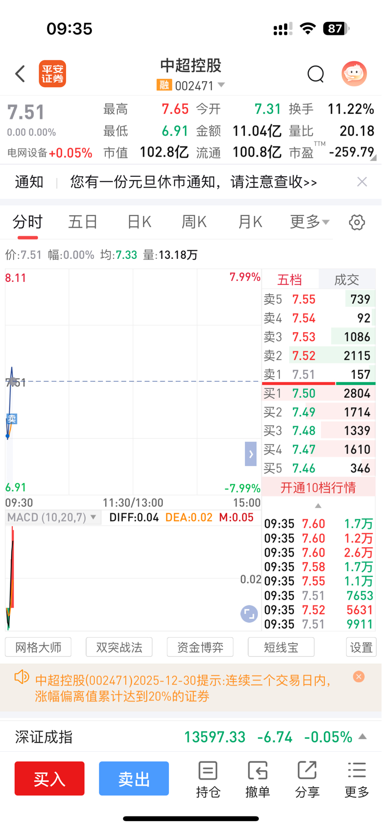 $中超控股(SZ002471)$ 慢一秒都卖不到这个点