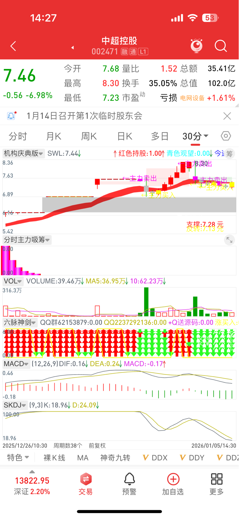 $中超控股(SZ002471)$ 看尾盘再看看均线能不能稳的住