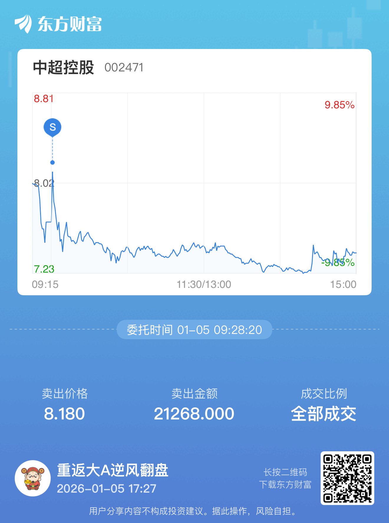 温馨提示: 1.根据《证券法》规定,禁止编造、传播虚假信息或者误导性信息,扰乱证券市场;2.用户在本社区发表的所有资料、言论等仅代表个人观点,与本网站立场无关,不对您构成任何投资建议。用户应基于自己的独立判断,自行决定证券投资并承担相应风险。《东方财富社区管理规定》