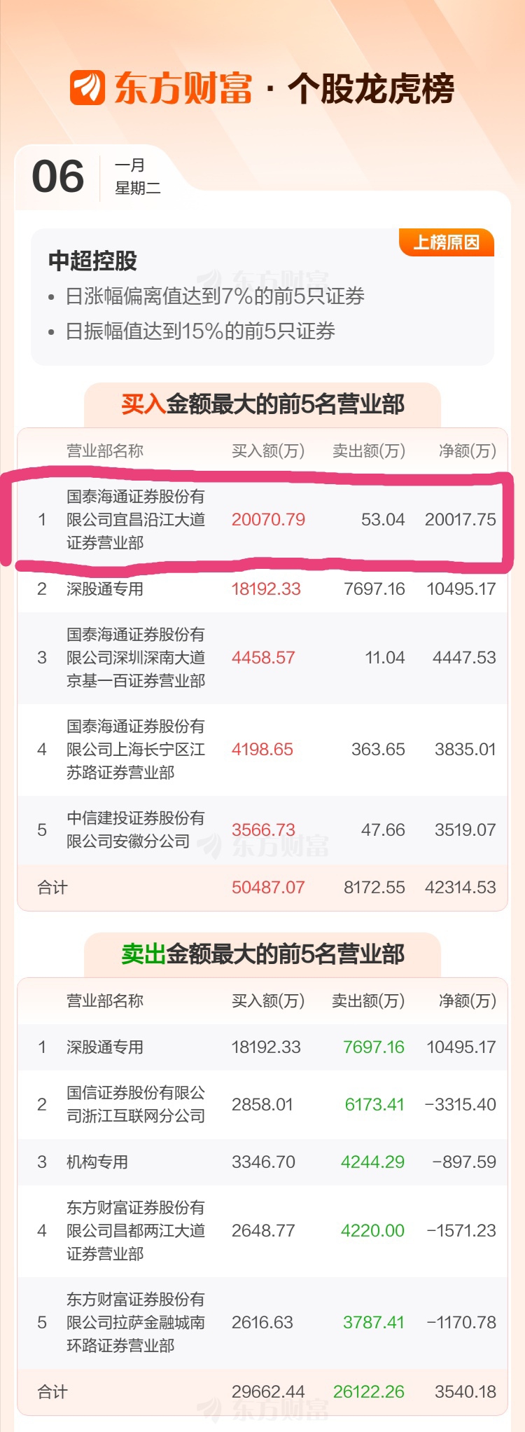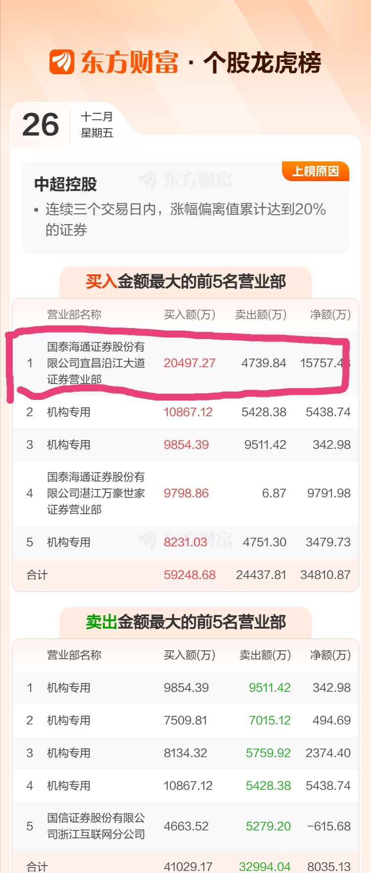 $中超控股(SZ002471)$ 兄弟们下图↓龙虎榜26日和今天对比,还是那个手握十几亿的榜一,明天雷科进异动监管应该不会再封板,商业航天低位龙头刚好超哥接替。榜一上一轮他格局了4、五天,明天一字起飞,继续躺赢。