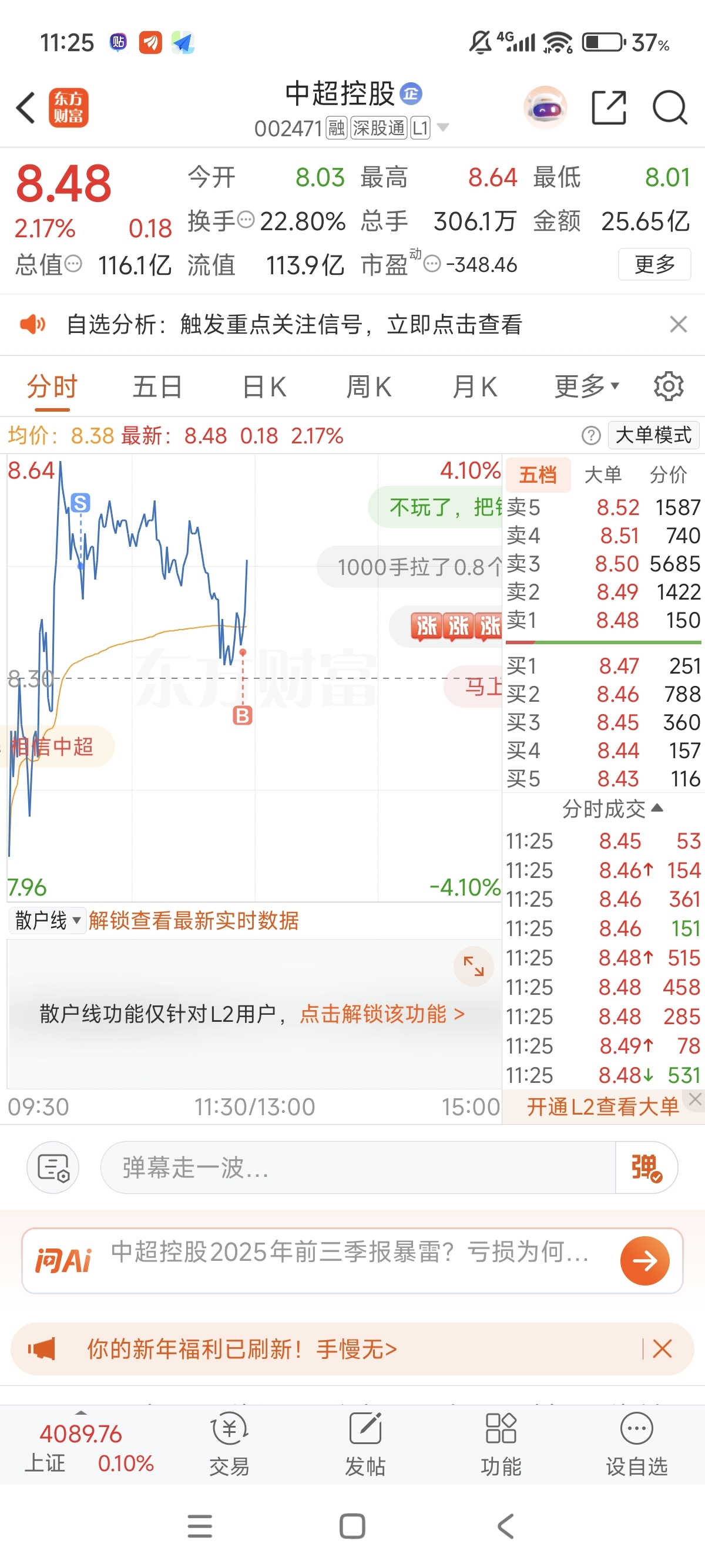 $中超控股(SZ002471)$ 精准,今天所有预测都准的可怕