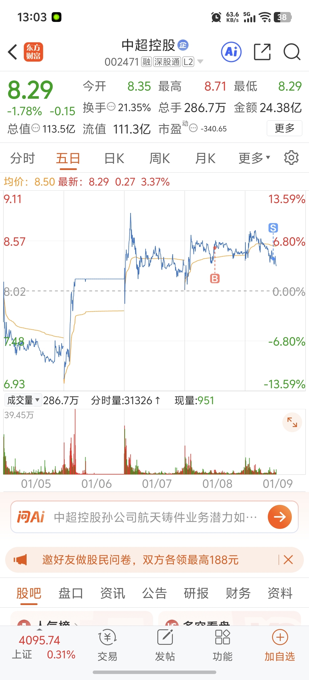 $中超控股(SZ002471)$ 真lg,早知道早上3个点跑了还盈利呢。