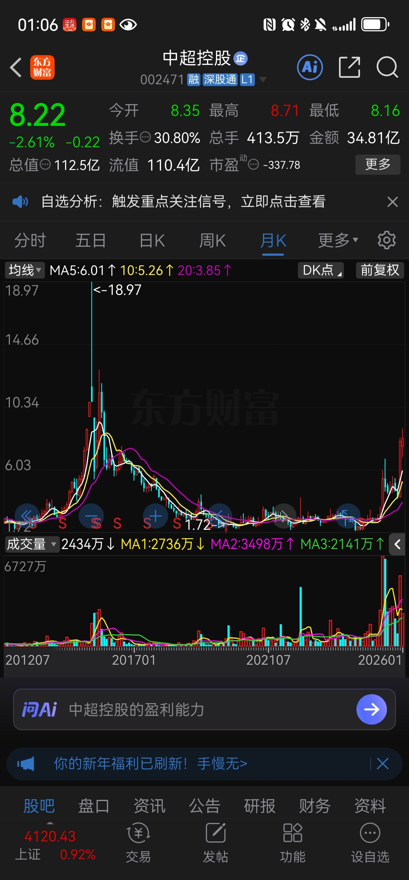 $中超控股(SZ002471)$ 长线继续加仓即可。
