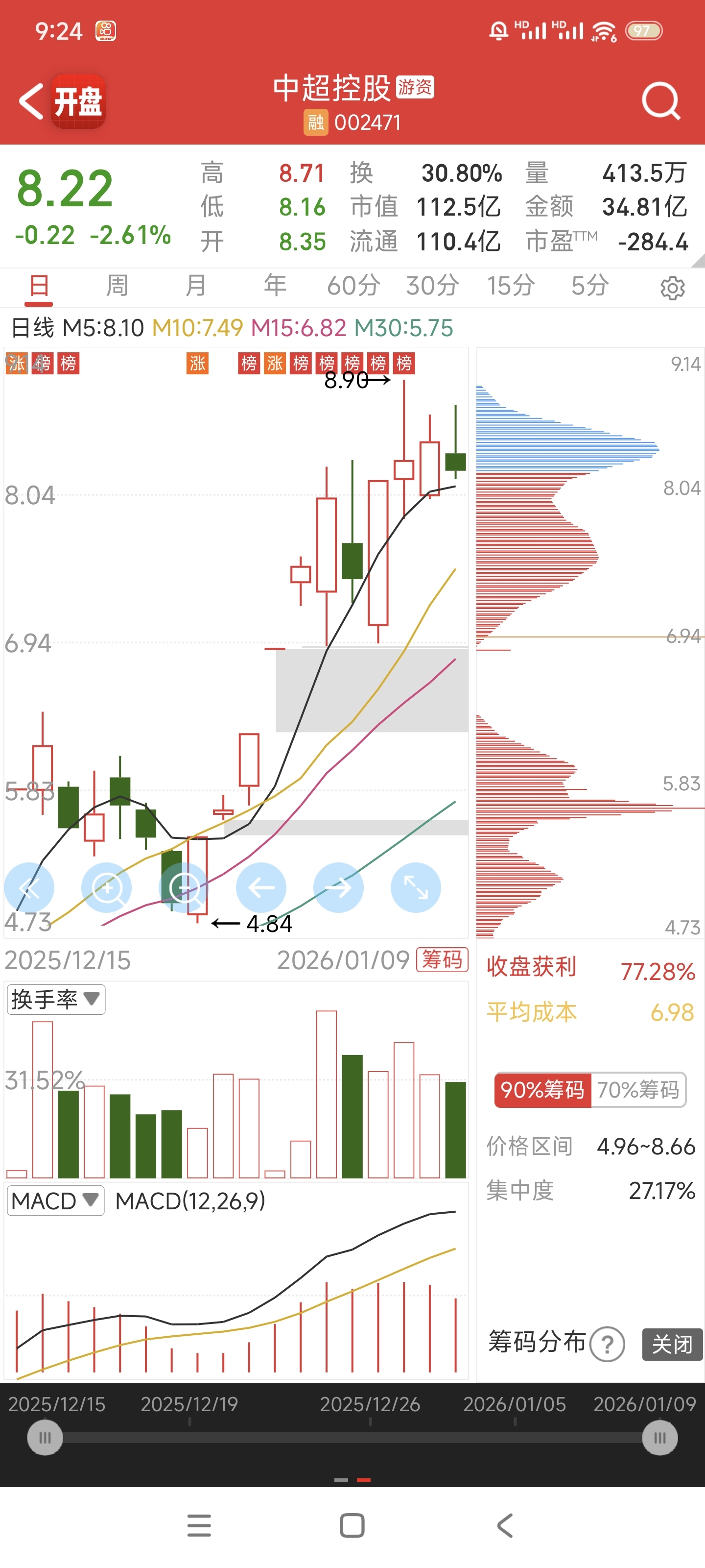 $中超控股(SZ002471)$ 来不会算预算我给你们算一下,涨两天 8.22x1.1x1.1=9.9462,不超10块没异动,这是10日100%涨幅 接着涨两个板9.95x1.1x1.1=12.0395 10涨幅继续往后推两天 不会异动 30日涨幅也不会异动。后面还能盘整 走趋势慢慢往上打。或者洗盘 下播连板!