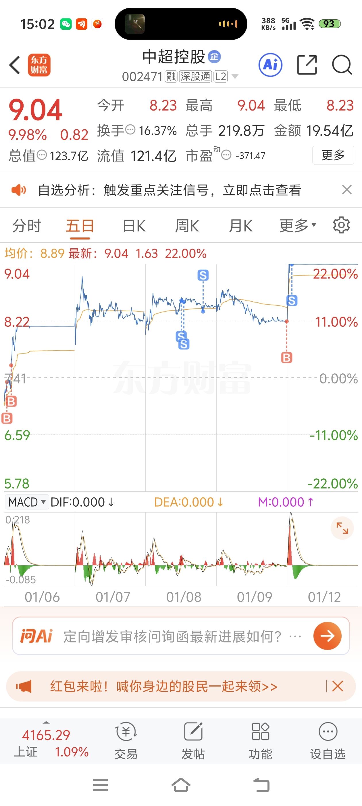$中超控股(SZ002471)$ 先出了一半。。