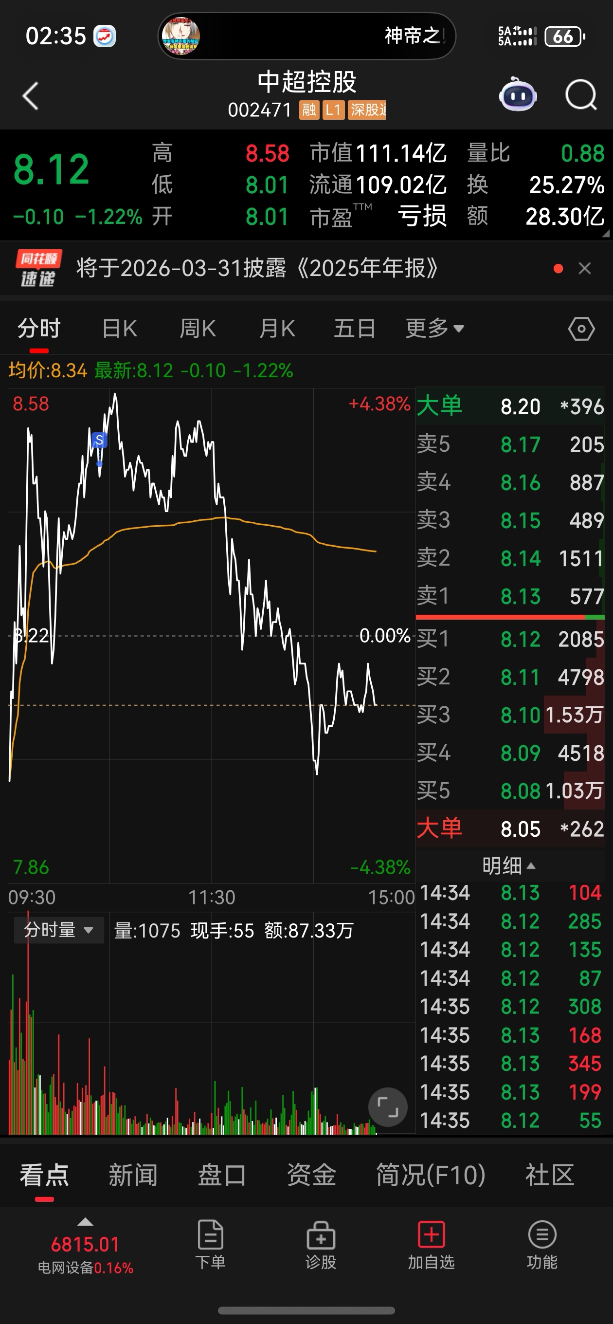 $中超控股(SZ002471)$ 认输,亏了13个点,好家伙