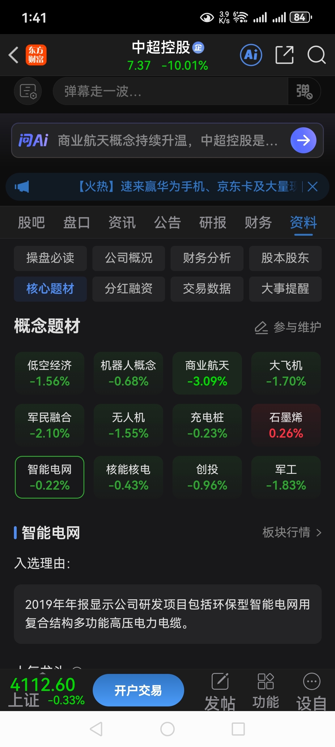 明天开始买入,买入理由是马斯克加大反重力航空航天研发,中超控股已经研发成功了反重力航空航天产品而且已经供货!公司研发多种特高压线缆国家电网已经有14亿元订单。还有机器人产品,核能核电和无人、机石墨烯、智能电网、商业航天、大飞机反重力!