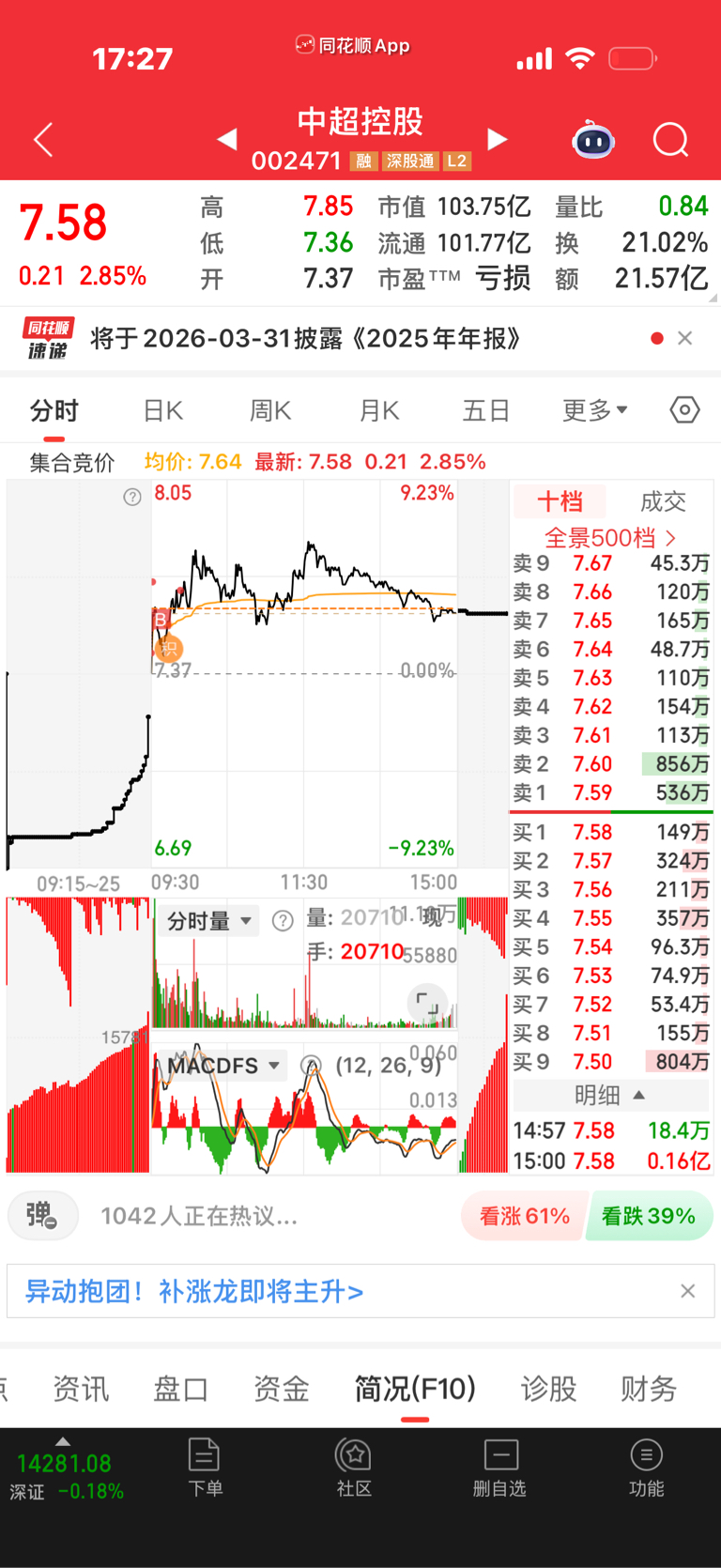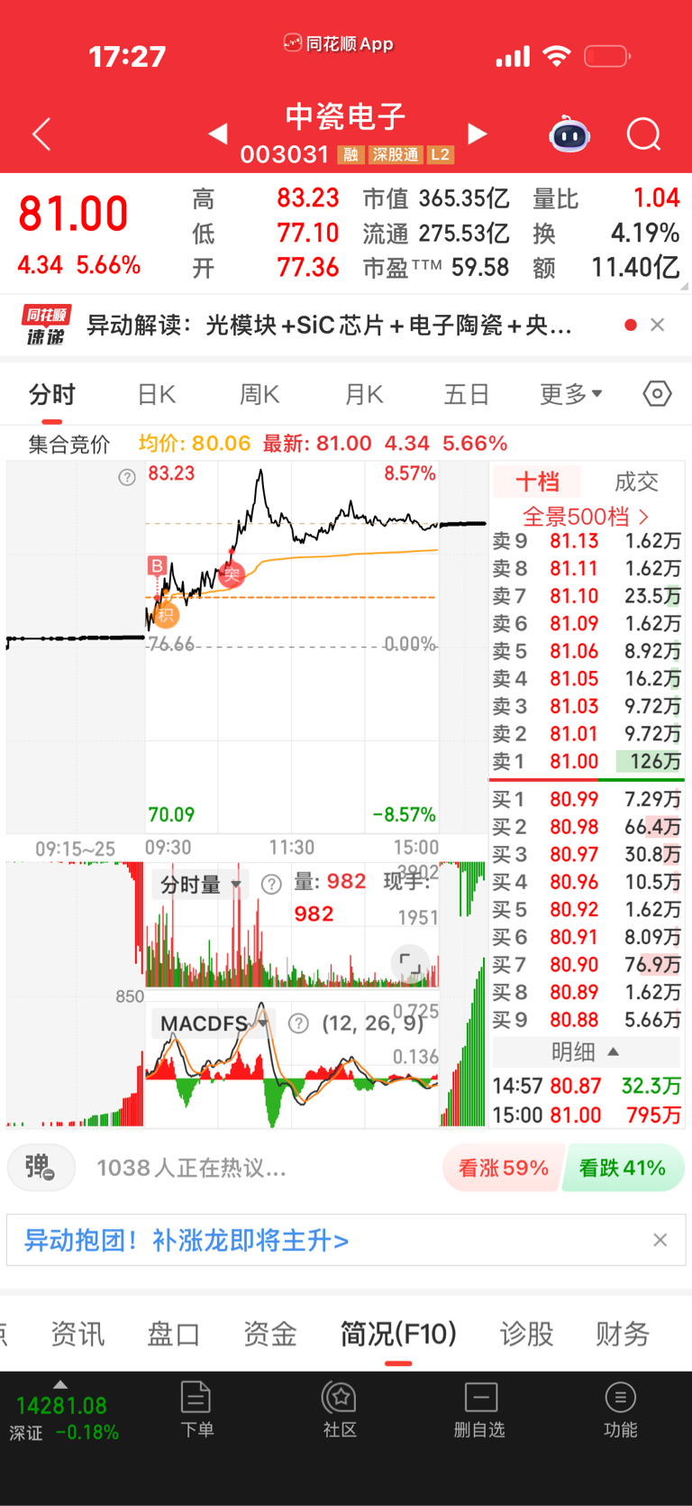 $中超控股(SZ002471)$ $中瓷电子(SZ003031)$ 中超控股~周五,十分之一仓位,周五电力开的太高,就没去,中超开盘算超预期,位置合适,又相关。周一下有均线支撑,上有打开空间可能