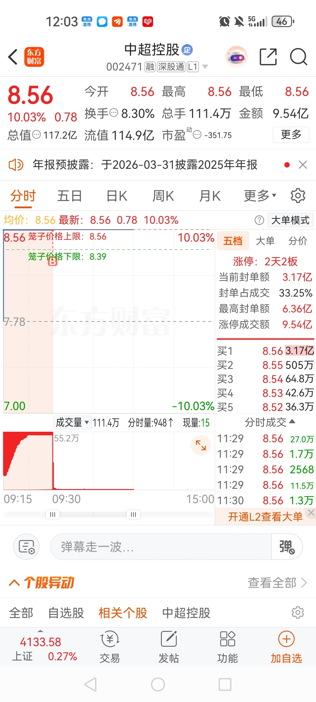 $中超控股(SZ002471)$ 居然买进去了,估计尾盘要炸板,建议有先手的朋友赶紧跑路,这货最爱玩天地板
