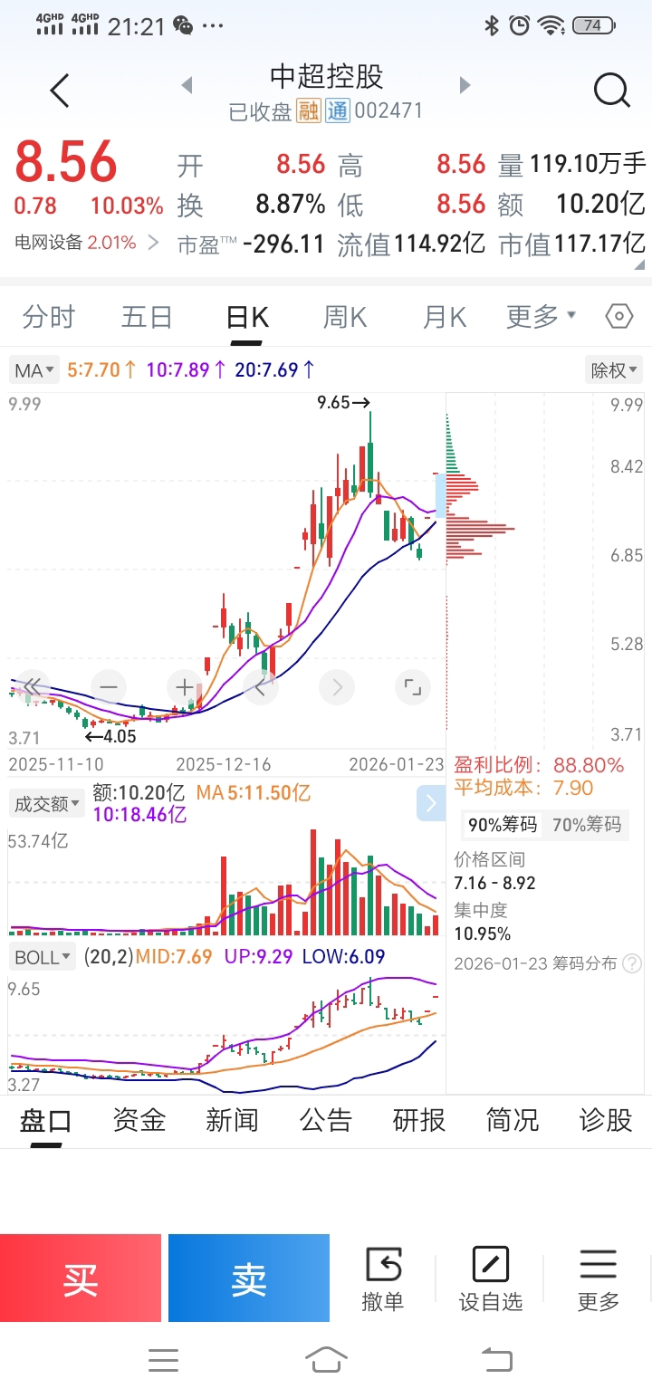 $中超控股(SZ002471)$ 你们看看中超的筹码分布图,在经过为期一周的巨量换手洗盘之后,其低位的套牢和获利筹码已经被全部几近洗出,盘面非常干净,主力可以任意拉升,没有其他搅局者干扰,