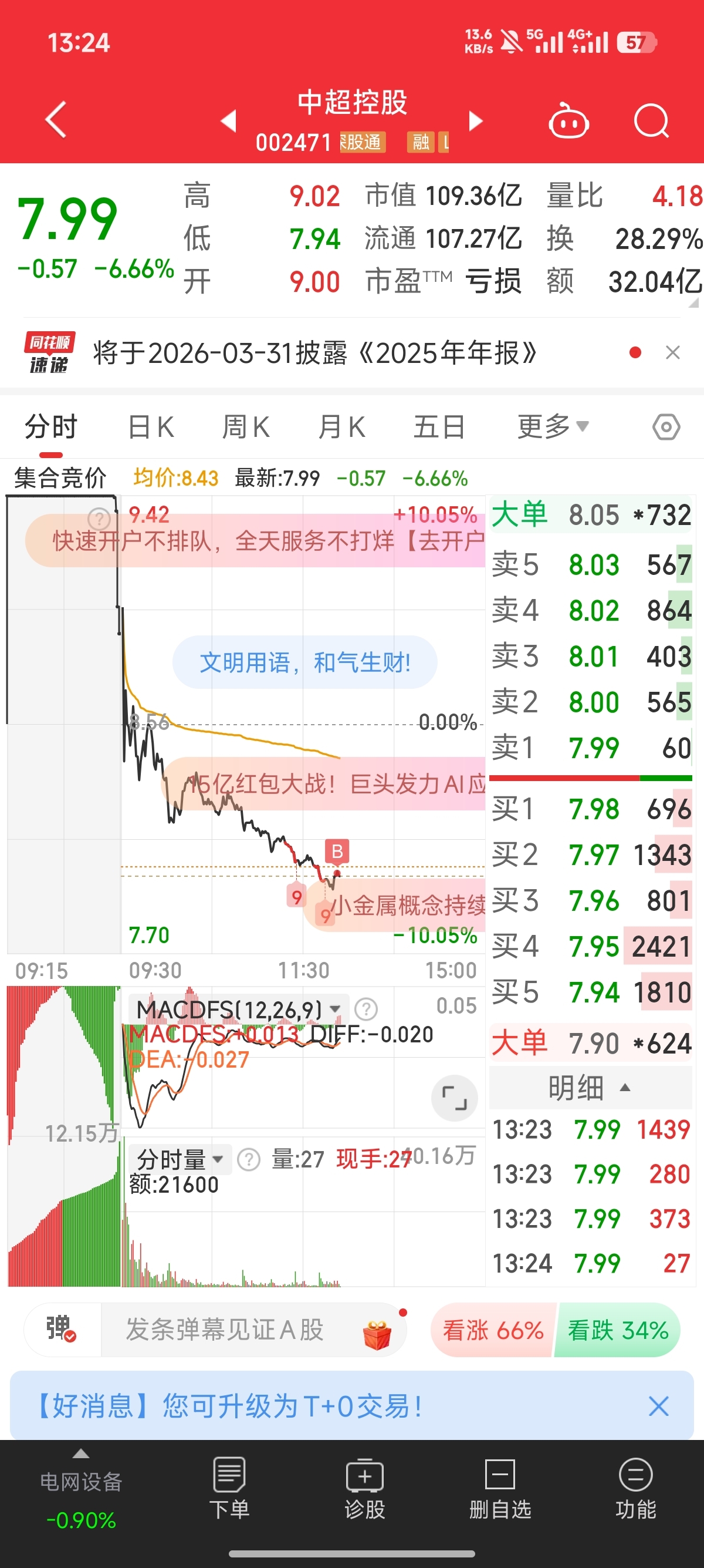 $中超控股(SZ002471)$ 8块买两手,助力跌停