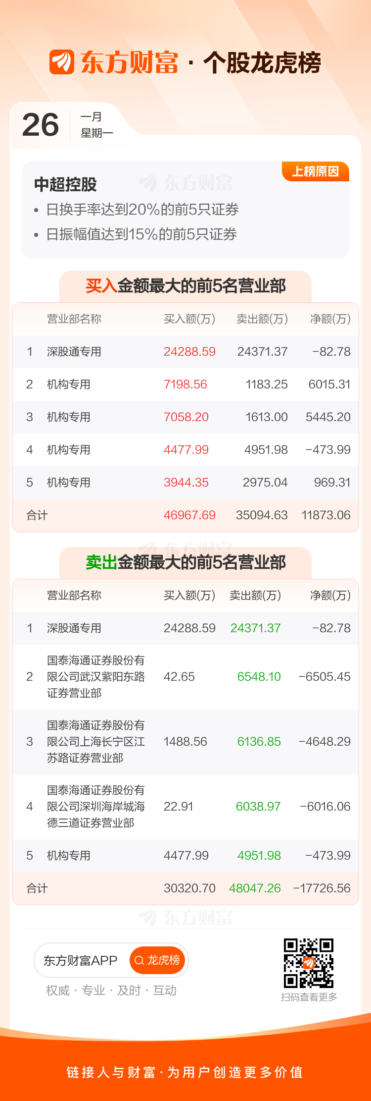 交易所2026年1月26日公布的交易公开信息显示,中超控股因成为日换手率达到20%的前5只证券、日振幅值达到15%的前5只证券上榜。中超控股当日收报7.96元,涨跌幅-7.01%,偏离值33.98%,换手率34.00%,成交额38.11亿。