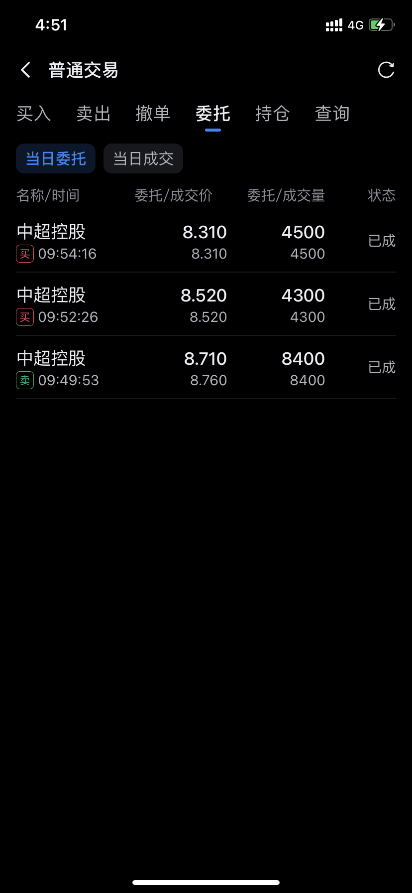 $中超控股(SZ002471)$ 开板前几秒跑的。后面52接了。中间挂单31最低价接的。还可以吧。