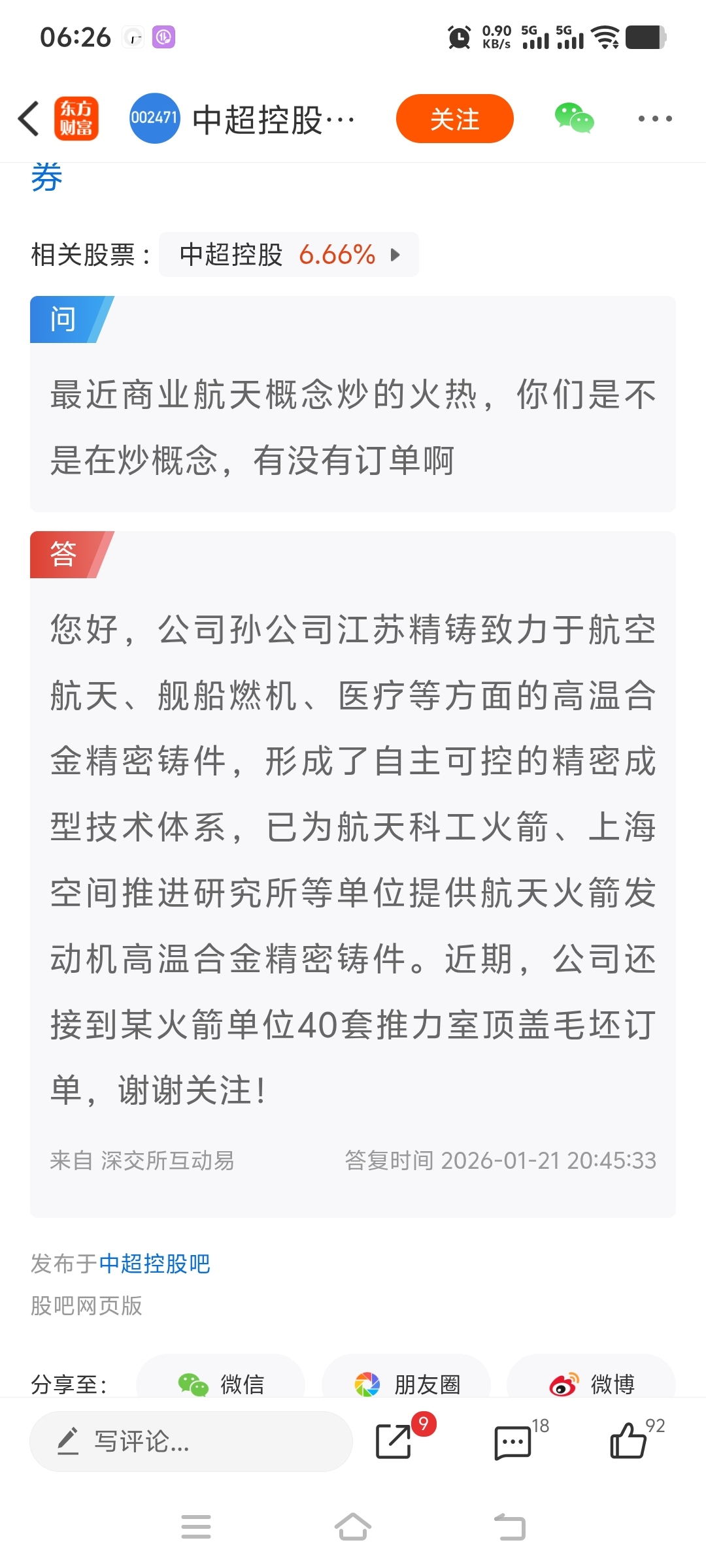 $中超控股(SZ002471)$ 中超的订单已实锤,40套火箭发谢订单。