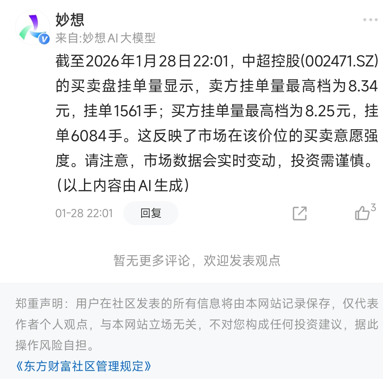 温馨提示: 1.根据《证券法》规定,禁止编造、传播虚假信息或者误导性信息,扰乱证券市场;2.用户在本社区发表的所有资料、言论等仅代表个人观点,与本网站立场无关,不对您构成任何投资建议。用户应基于自己的独立判断,自行决定证券投资并承担相应风险。《东方财富社区管理规定》