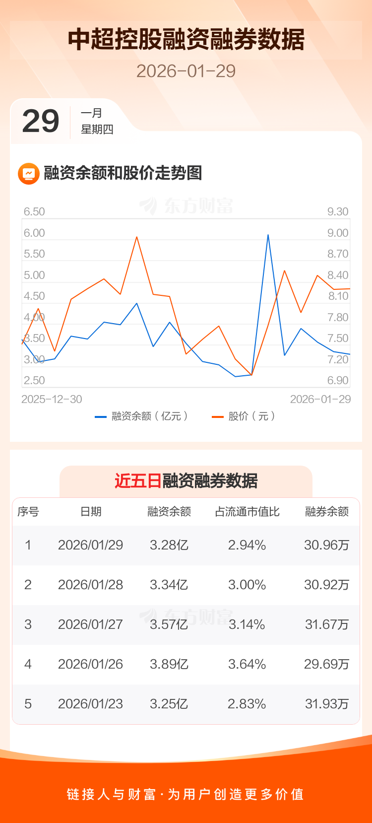 交易所最新数据显示,中超控股于2026年1月29日获融资买入1.45亿元,融资偿还1.51亿元,当日融资净偿还586.65万元。目前,该股融资余额3.28亿,占流通市值比例为2.94%。