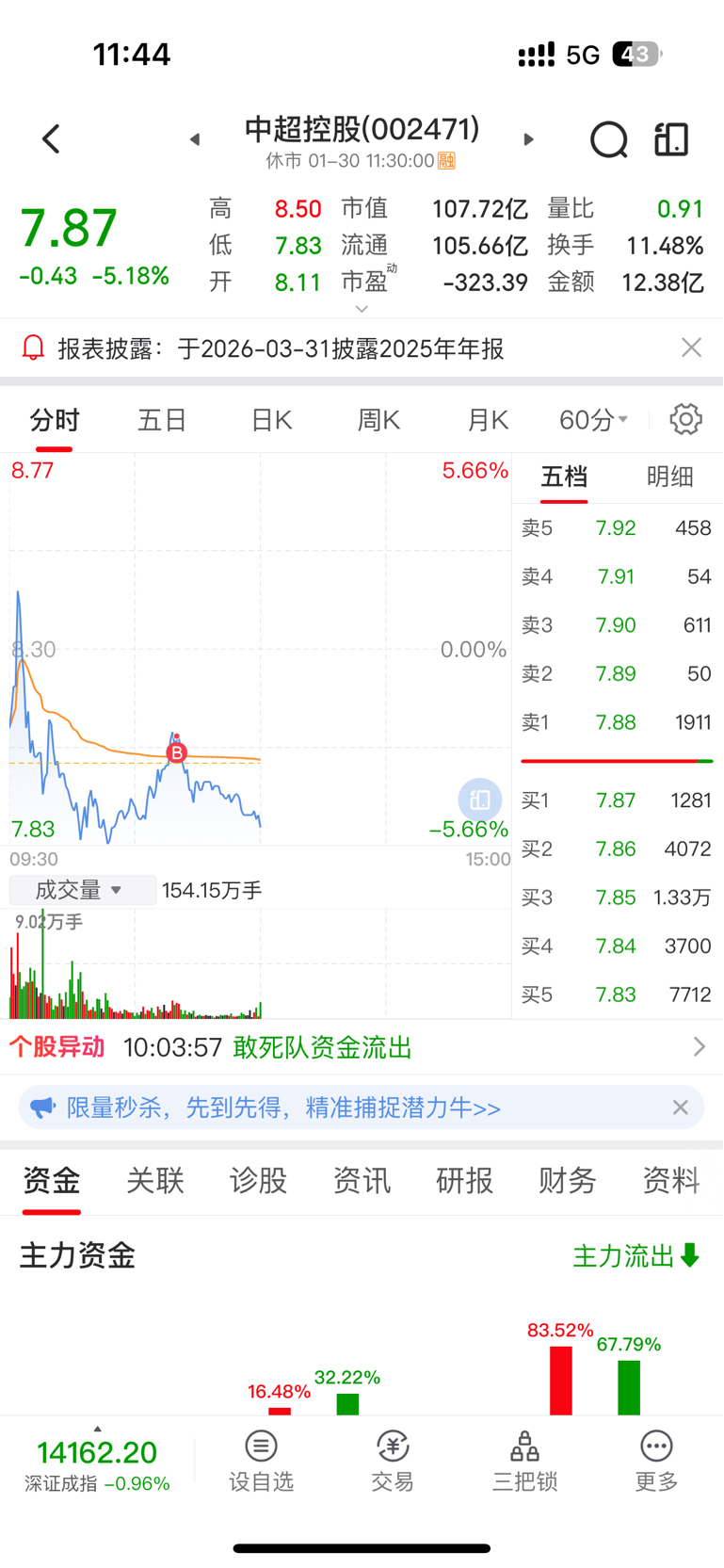 $中超控股(SZ002471)$ 我自己都笑了。挂7.81没买进去。撤单挂了8.1
