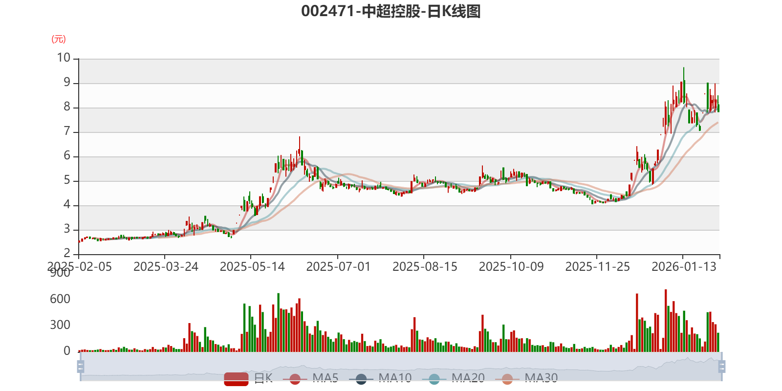 中证智能财讯中超控股(002471)1月30日晚间披露2025年度业绩预告,预计2025年归母净利润亏损1800万元至2800万元,上年同期亏损2140.43万元;扣非净利润亏损2200万元至3200万元,上年同期亏损4407.35万元;基本每股收益-0.0133元/股至-0.0208元/股。以最新收盘价计算,市净率(LF)约5.95倍,市销率(TTM)约1.98倍。