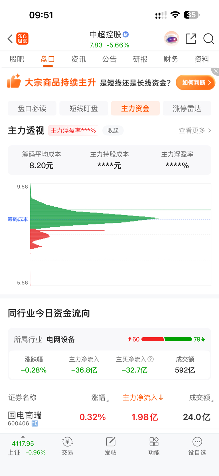 $中超控股(SZ002471)$ 虽然我不知道主力筹码多少,但看这图套牢盘太多了主力明显是在往外派发筹码,不能拉了,拉上去绿色部分全是抛压
