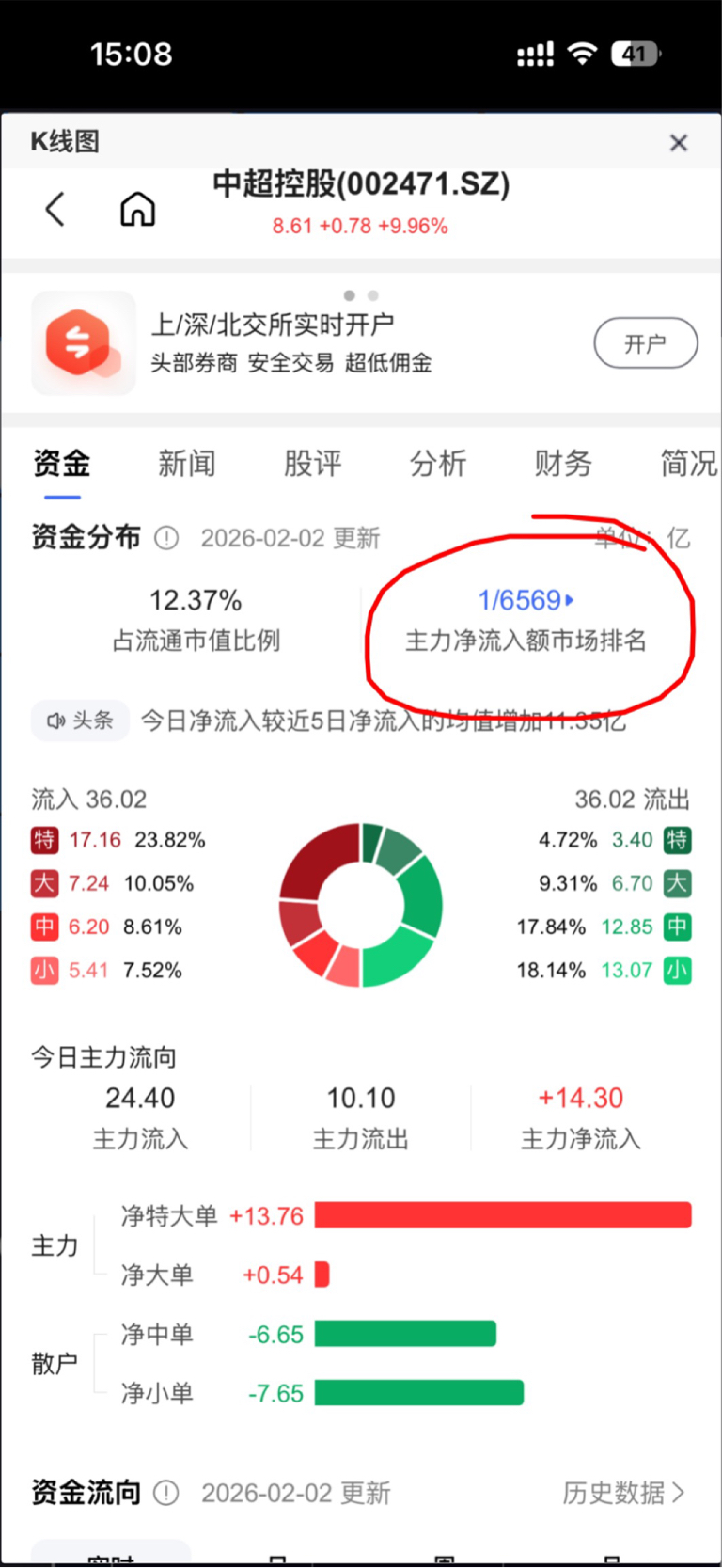 $中超控股(SZ002471)$ 主力今天有点猛啊,净流入六千股排第一