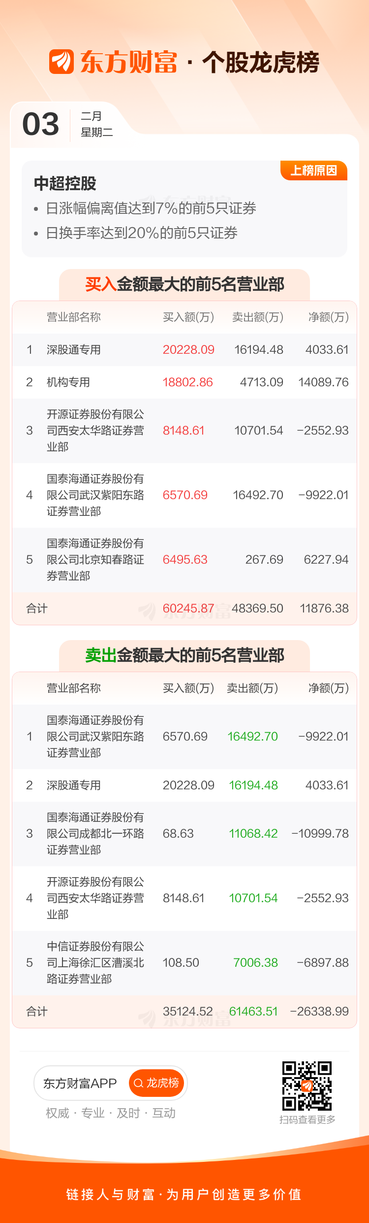 交易所2026年2月3日公布的交易公开信息显示,中超控股因成为日涨幅偏离值达到7%的前5只证券、日换手率达到20%的前5只证券、连续三个交易日内,涨幅偏离值累计达到20%的证券上榜。中超控股当日收报9.47元,涨跌幅9.99%,偏离值7.65%,换手率44.89%,成交额54.32亿。异常期间2月2日至2月3日,期间涨幅20.95%,累计偏离值21.20%,区间成交额90.34亿。