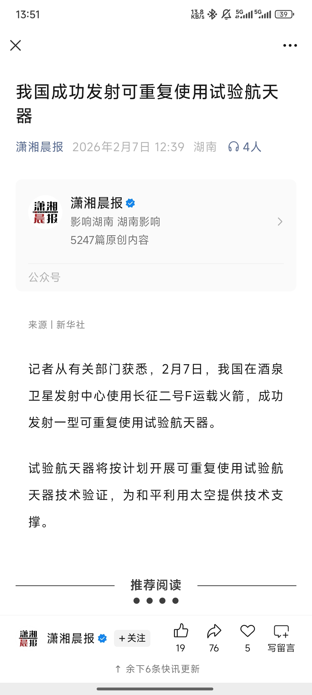 2月7号成功发射可重复使用试用航天器