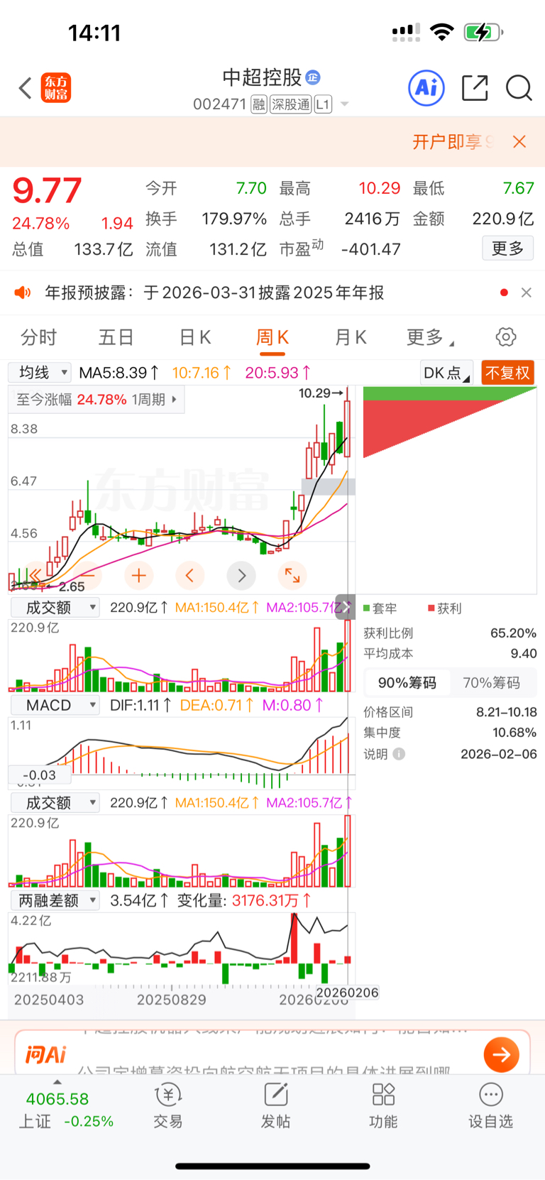 $中超控股(SZ002471)$ 这周的换手率已经180%了还是没有站上10元,分歧太大了,抛压有点大啊,下周一二估计要调整2,3天了
