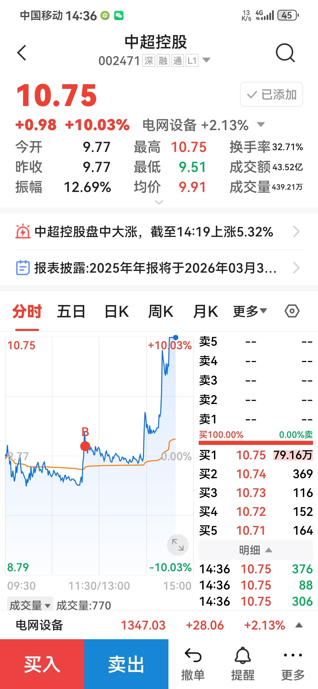 $中超控股(SZ002471)$ 不出意外的话,明天一字板了!估计是武汉紫阳路的功劳