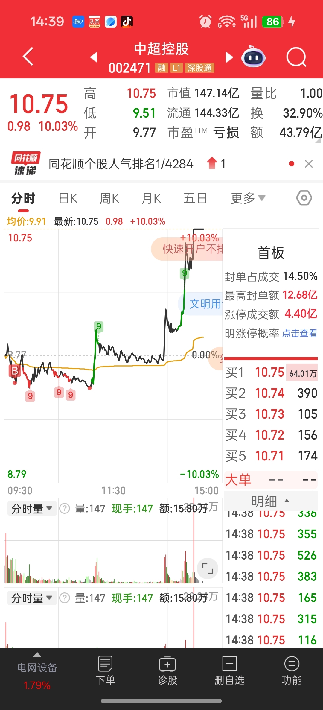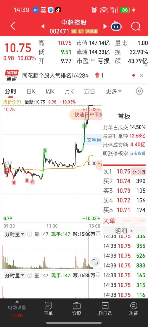 $中超控股(SZ002471)$ 双连板登龙虎榜,机构+深股通+量化游资合力抢筹,54.32亿成交额+44.89%高换手,主力净流入3.21亿、机构净买2.4亿,散户资金净流出1.15亿,商业航天+特高压双主线共振,资金认可度直接拉满#复盘记录# #收盘点评#