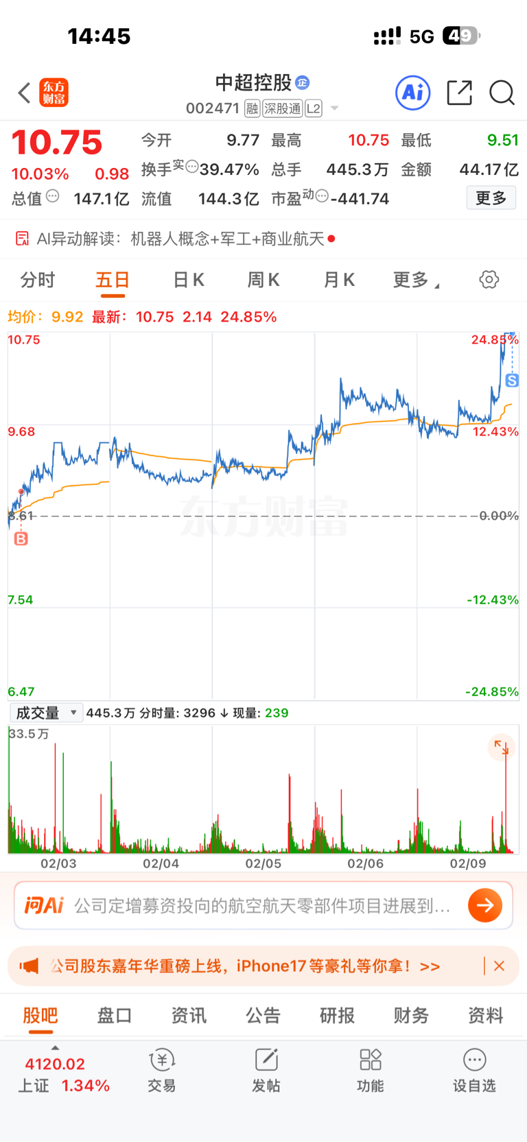 $中超控股(SZ002471)$ 全仓赚了20个点,走了走了 安心过年